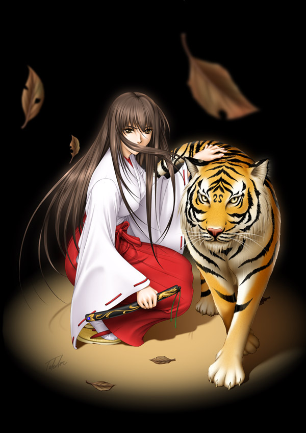 思い浮かばなかったので、ちょっと描いてみたかった巫女さんの服で隣にトラを描いてみましたね。
