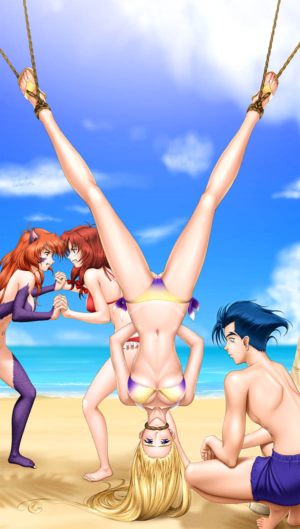 シャロン「あ、アストラル!?どうしてここに!」 -もしかして私を助けに! シャロンはいきなりアストラルが傍らに立っているのを見てびっくりし自分を救いに来たものだとばかり思い頬をうっすらと染めて喜んだ。 アストラル「?浜辺を歩いてたらシャロンを見つけたんでつけてきたんだけど、こんな所で皆揃って何してるの?それに何で吊られて・・・」 アストラルはシャロンが吊られその後ろでミューとニーナが言い争っているのを不思議そうに見ながら腰を落とした。 シャロン「こいつら・・あの二人に騙されて・・・お願いだからロープを解いてくれない?」 アストラル「ん?あ、ああ・・・ロープを解けばいいんだね?」 シャロンの簡素な説明にアストラルはあまり状況が良く飲み込めなかったが、一応頷いてシャロンの口を縛っているロープを顔の左右から腕をまわして解きにかかった。 -アストラルの・・胸が・・・ アストラルがシャロンの体を前から包む様にロープを解こうとしている為、アストラルの引き締まったたくましい胸がシャロンの目に映りシャロンはその胸板に先ほどまでの事は忘れてうっとりした。 アストラル「っ、結構縛りがきついな・・・」 体勢の悪い前からの為かまったくロープは解けず、アストラルは解きやすいように腕を小刻みに動かした。 -んっ!胸に当たってる・・・ アストラルが腕を動かす度に、左右の二の腕の部分がシャロンの突き出た胸に頻繁に触れシャロンはちょっと恥ずかしくなった。しかしアストラルはロープを解くのに必死になっている為か、シャロンの柔らかい胸に触れているのも気になない様でただひたすらロープを解く作業を続ける。すると次第にシャロンの胸に当たる腕の力が強くなり自分の胸がアストラルの腕によって大きく歪み、時折両腕に胸が挟まれギュッと潰れるのでアストラルに揉まれている様に感じ少しHな気分になり始めていた。ところが、あまりに何度も腕が胸に触れ、それに合わせて水着がせわしなく伸び縮みした為、胸の中央で結んである水着の紐が口のロープよりも先に解け始めた。 シャロン「あ!アストラル、水着が!」 アストラル「水着?」 |